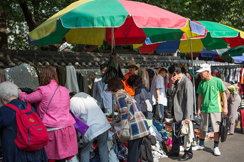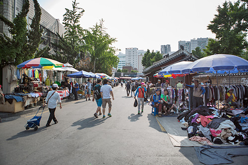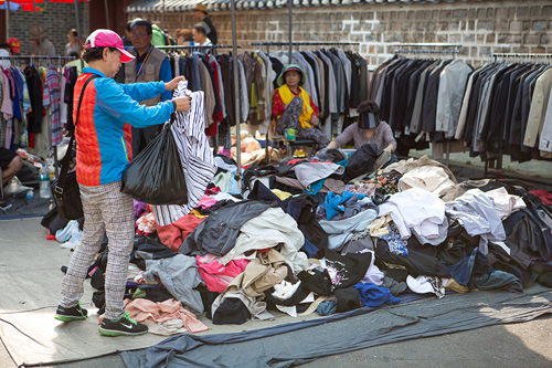 400年以上の歴史をもつ祀堂・東廟(トンミョ)の敷地を取り囲むように開かれている「トッケビ市場」は、洋服が無造作に積まれており、それをかき分けて自分の好みの服を探すスタイルの超パワフルマーケット。