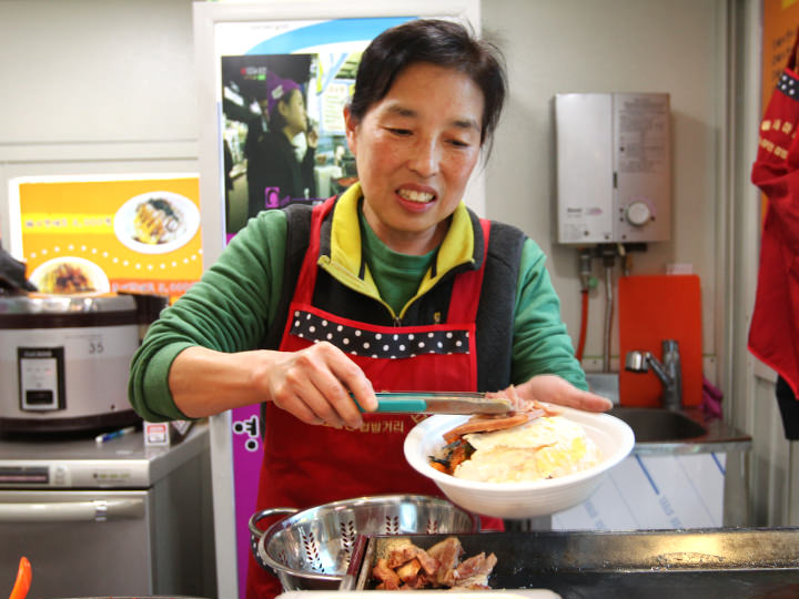 鷺梁津駅周辺は国家試験対策の予備校が集まっているエリア。お金のない予備校生のためにコッパッ(カップ飯)と呼ばれるボリュームたっぷりのカップ入りごはんが名物メニューでした。 一時は撤去の危機にもさらされましたが駅前の再開発とともに屋台通りも一新。学生をはじめ鷺梁津水産市場を訪れる外国人からの人気も集めています。
