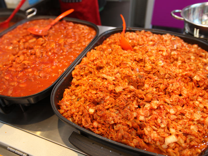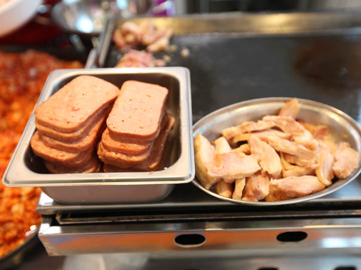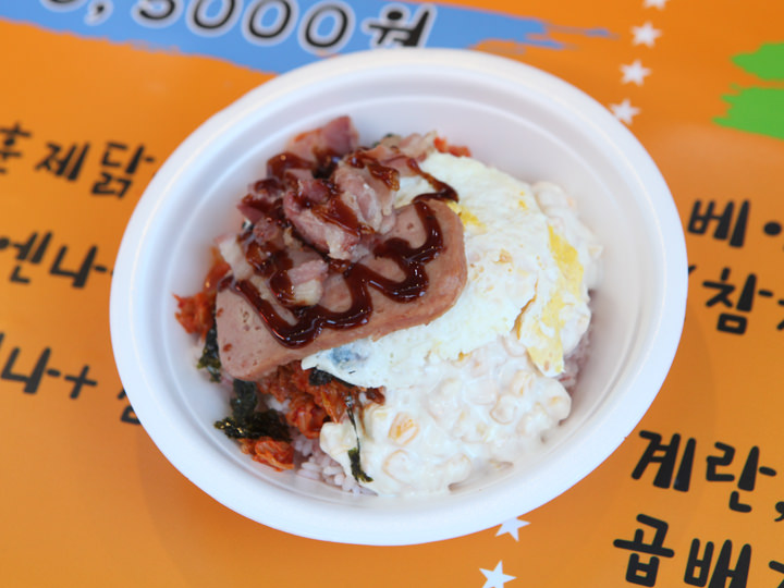 屋台通りを代表するメニューのカップ飯。寝る間も惜しんで勉強する予備校生のために、早く食べられるように色んなおかずがひとつの器に盛られている、いわゆるビビンバスタイル。屋台のカウンターにはスパムやソーセージ、鶏肉の燻製風、卵焼き、炒めた豚肉やキムチなどの具材がずらり。毎日食べても飽きがこないよう、組み合わせは色々、20種類近くのカップ飯を味わうことができます。