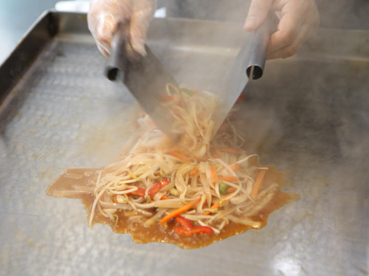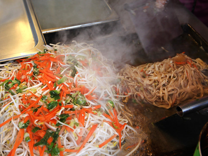 パッタイは米粉で作られる平たいビーフンを使った焼きそば。こんなエスニック料理も屋台で食べられるのは鷺梁津ならでは!こちらも屋台通りでは定番メニューのひとつで、栄養価が気になる学生のためにもやしや人参などの野菜がたっぷり。鉄板のじゅうじゅうという音を聞いているだけでお腹がすいてきそうです。