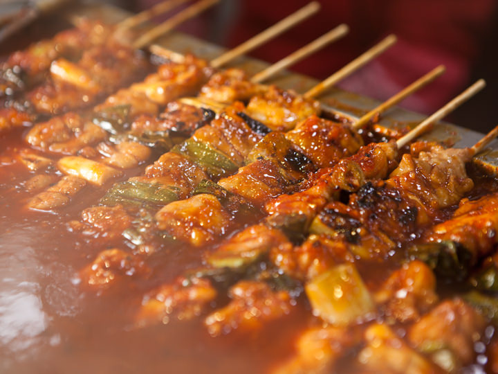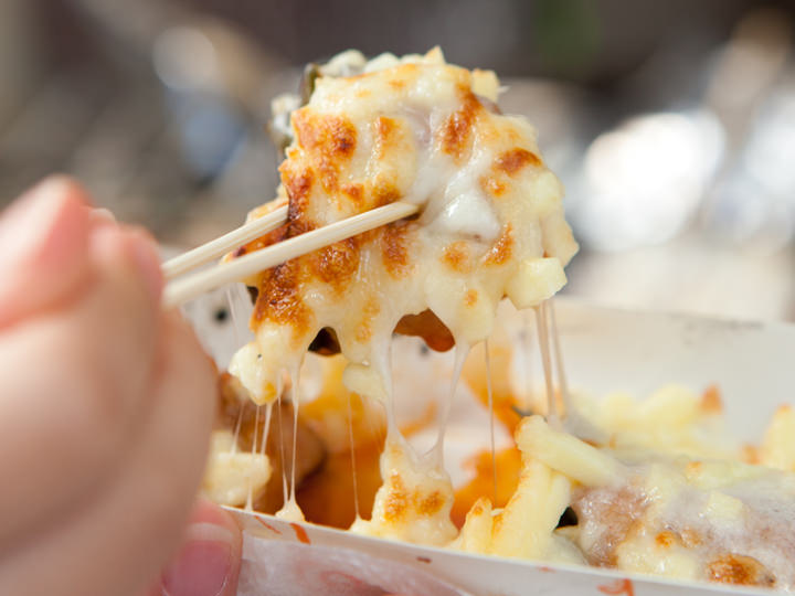 韓国の屋台グルメの定番、焼き鳥は醤油と辛口の2種類。鶏肉とネギが交互になった串は日本の焼き鳥よりもかなりビッグサイズ。女の子なら1本食べるとお腹いっぱいになりそうです。人気はチーズのトッピング。特に辛口にかけるとマイルドになって食べやすくなります。