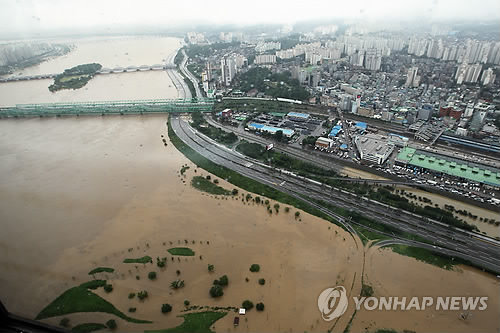 400ミリを超える大雨に見舞われたソウル市のようす=27日、ソウル(聯合ニュース)