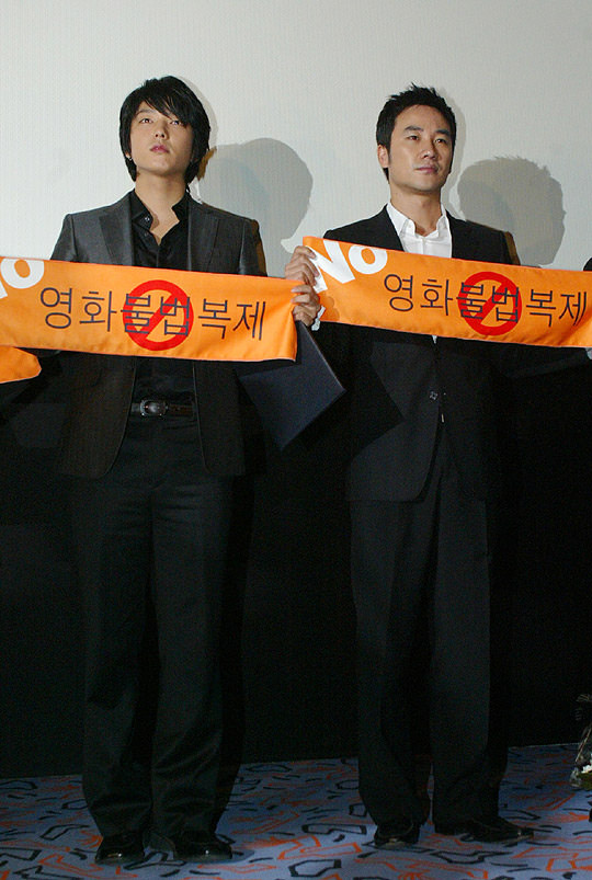 22日、ソウル忠武路大韓(チュンムロ、テハン)劇場で映画不法複製防止のための映画人大会が開かれた 不法コピー防止広報大使に任命されたオム・テウン(右)とイ・ジュンギ(左)。