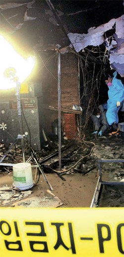5日釜山市釜田洞のカラオケ店で火災が起こり、9人の客が死亡し25人が負傷する惨事が発生した。6日午前に火災現場で合同鑑識班が鑑識を行っている