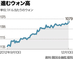 だがよく見ると韓国内の状況は異なる動きを見せている。昨年は韓国銀行が基準金利を引き上げるなど景気回復への期待感が大きかった。しかし現在は景気が悪くなる低成長局面が本格化し、韓国銀行は反対に基準金利を2度も引き下げた。物価が大きく上がった昨年はウォン高が物価負担を減らす役割をしたが、物価が安定傾向を見せている今年は得られるものも多くない。延世(ヨンセ)大学のソン・テユン教授は、「今年は大統領選挙まで行われるため、通貨当局で積極的な通貨拡大政策を展開しにくい。ウォン高傾向は韓国の輸出競争力を弱めるだけの否定的要因として作用している」と診断した。
