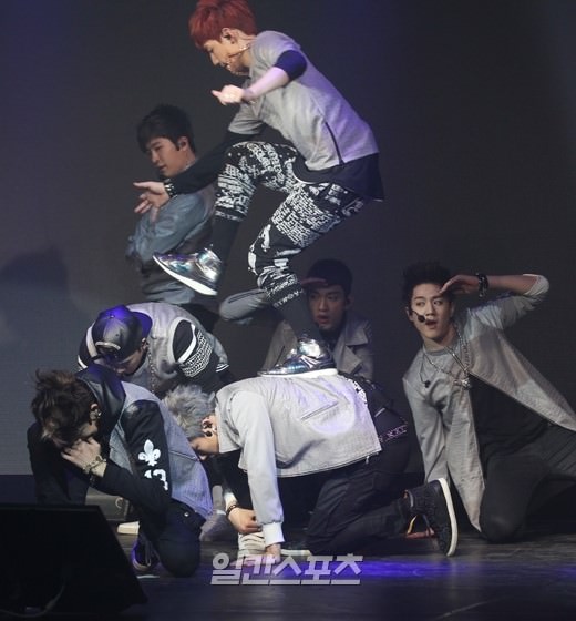 JYPエンターテインメントの新人グループGOT7のプレスショーケースが15日、ソウル聖水洞(ソンスドン)のデリム倉庫で行われた。メンバーがダンスを披露している。