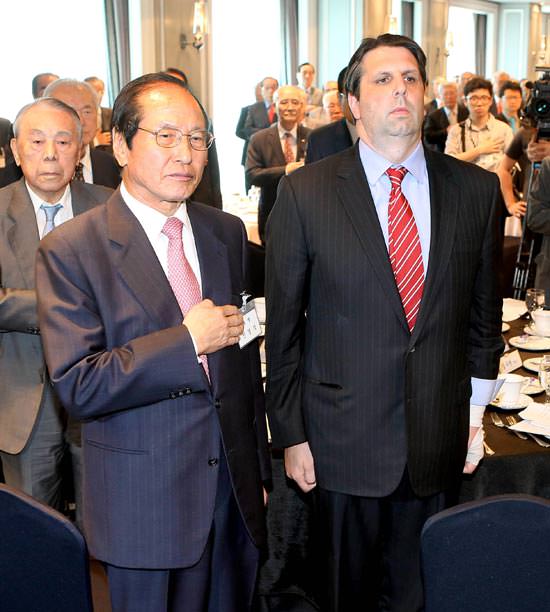 4日、講演開始に先立ち、国旗に対する敬礼の際、リッパート大使が直立不動の姿勢で太極旗(韓国の国旗)を見つめている。左側からイ・チョルスン憲政会元老会議議長、シン・ギョンシク憲政会会長、リッパート大使。