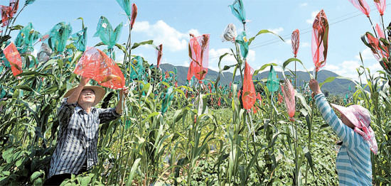 処暑だった23日、忠清南道論山(チュンチョンナムド・ノンサン)のキビ畑で農民らが穀類保護のために保護ネットをかぶせている。台風15号の影響で24日は南部地方から雨が降るものと予報されている。