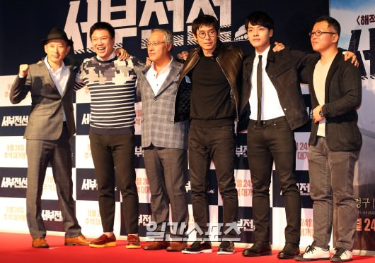 映画『西部戦線』のVIP試写会が21日午後8時からソウル松坡区新川洞(ソンパグ・シンチョンドン)のロッテシネマワールドタワー店で開かれた。チョン・ソンイル監督をはじめ出演陣がフォトタイムでポーズを取っている。