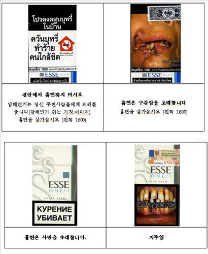 また、パッケージには健康被害についての警告文を掲載しなければならず、写真と合わせパッケージ面積の半分以上に表示する義務がある。