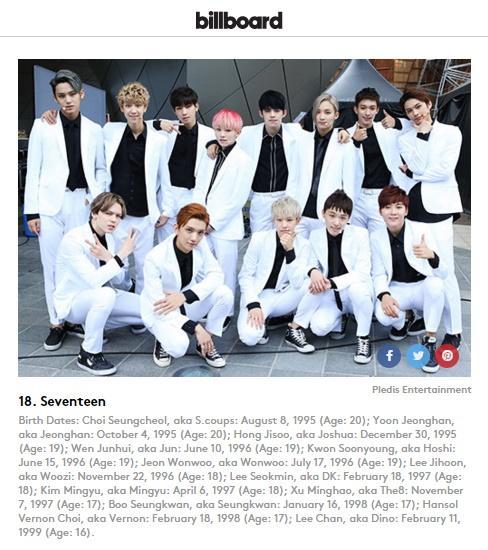 韓国新人Seventeen、「ビルボード21 Under 21」にアジア唯一選定