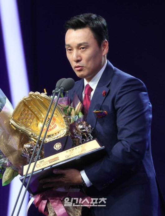 李承ヨプは今季122試合に出場して打率0.332・26本塁打・90打点を記録してサムスンのレギュラーシーズン5連覇を導いた。「不惑の四十」にも猛打を振るった李承ヨプは有効票358票のうち246票(68.7%)を獲得、チェ・ジュンソク(ロッテ、77票)とイ・ホジュン(NC、35票)に圧倒的な差をつけた。1塁手で7回(1997~2003年)、指名打者で3回(2012、14~15)のゴールデン・グラブを手にした李承ヨプは、史上初めて受賞10回を記録した選手となった。李承ヨプは最高齢受賞記録も塗り替えた。この日39歳3カ月20日の李承ヨプは、2013年李炳圭(イ・ビョンギュ、LG)が打ち立てた最高齢(39歳1カ月15日)記録を超えた。後輩選手にも引けをとらないビシっとしたスーツ姿で存在感をアピールした李承ヨプは「もう40代に入ったが、40代の人たちに良い方向を示せる機会になれば」とコメントした。