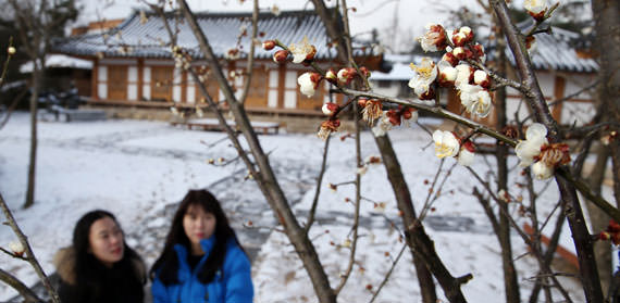 全羅南道康津郡康津邑(チョルラナムド・カンジングン・カンジンウプ)の四宜斎(サウィジェ)の近くに植えられた梅のつぼみが雪の中でも力強く開いている。