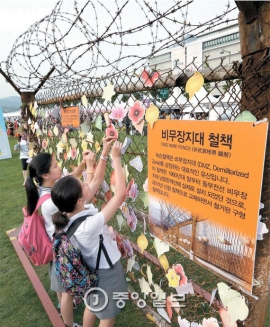 DMZ鉄柵に「統一希望」メッセージ