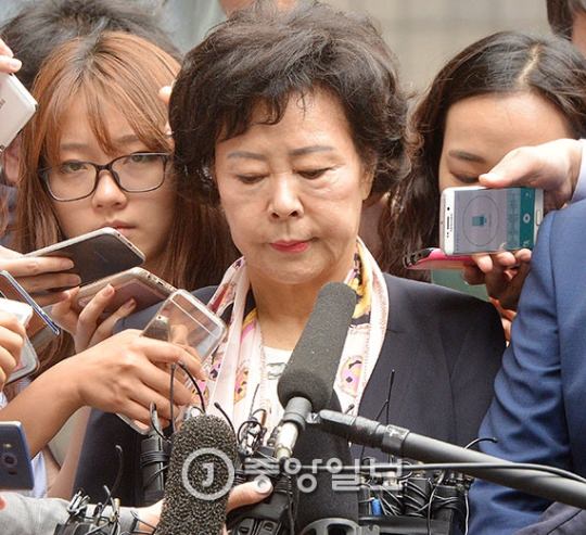 辛英子(シン・ヨンジャ)ロッテ奨学財団理事長が1日、ソウル中央地検の前で硬い表情で質問を受けている。