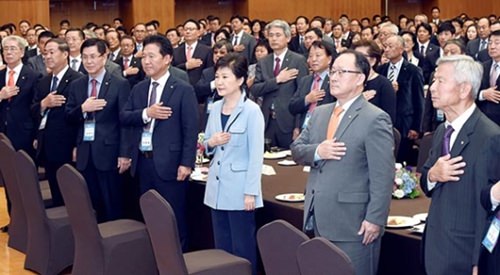 朴大統領が13日午後、青瓦台迎賓館で開かれた「民主平和統一海外諮問委員との統一対話」に出席し、国旗に敬礼している。(写真=青瓦台写真記者団)
