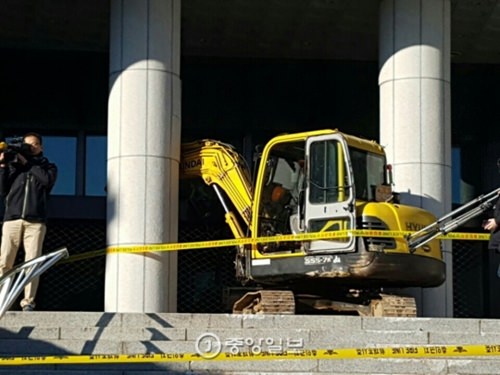 【写真】韓国大検察庁庁舎にフォーククレーン突進…侵入防ごうとした警備員が負傷