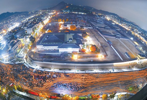 ソウルの景福宮(キョンボックン)光化門(クァンファムン)前の大通りにろうそくを手にした市民が波のように流れている。