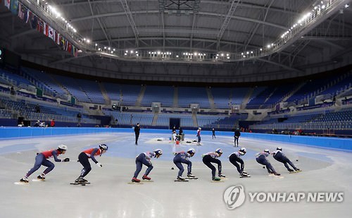 14日、江陵アイスアリーナで調整を行う選手たち=(聯合ニュース)