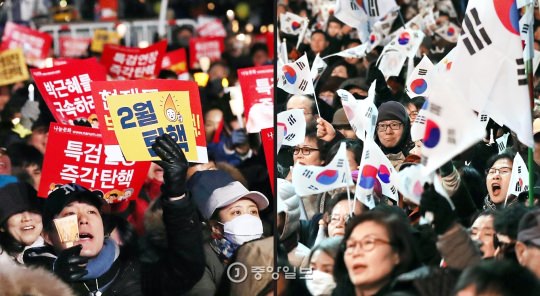 ろうそく集会(左)と太極旗集会