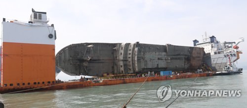 運搬船に載せられ陸揚げを待つセウォル号=7日、木浦(聯合ニュース)