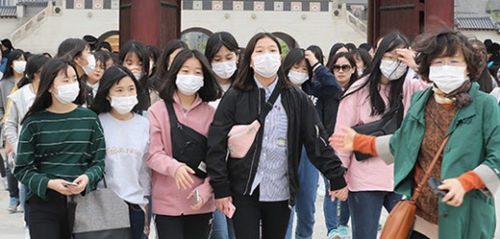 粒子状物質の濃度が「悪い」水準を示した20日、修学旅行の一環で景福宮(キョンボックン)を訪れた全羅南道(チョルラナムド)の霊光(ヨングァン)女子中学校の生徒がマスクをつけて移動している。