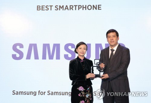 MWC上海で「ベストスマートフォン賞」を贈られたサムスン電子中国法人の副社長(右、サムスン電子提供)=29日、ソウル(聯合ニュース)