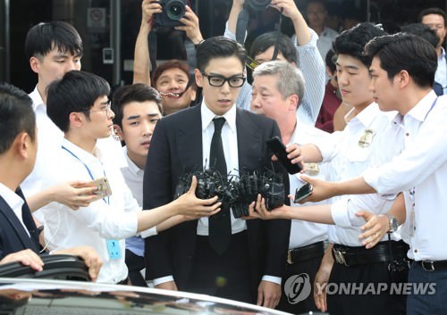 今月20日、判決公判が開かれたソウル中央地裁で報道陣に囲まれるT.O.P=(聯合ニュース)