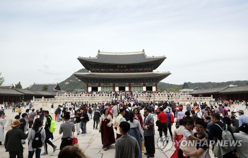 秋夕(中秋節、今年は10月4日)連休中の5日、ソウル中心部にある朝鮮王朝時代の王宮、景福宮は観光客や家族連れなどでにぎわっている