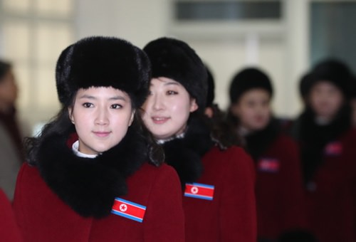 平昌(ピョンチャン)冬季オリンピック(五輪)で南北選手たちを応援する北朝鮮の応援団とテコンドー模範競技団などが7日、韓国を訪問した。