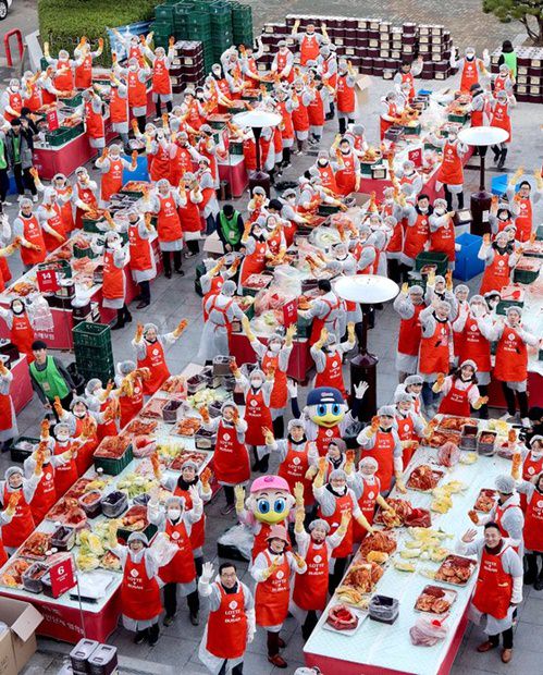 ロッテグループ釜山(プサン)地域系列会社の職員と釜山市民団体協議会のメンバーら400人余りが5日、釜山市東莱区(トンネグ)の社稷(サジク)野球場で低所得者などの疎外階層に伝達するキムチを漬ける作業の途中、上からのカメラに向かって手を振っている。