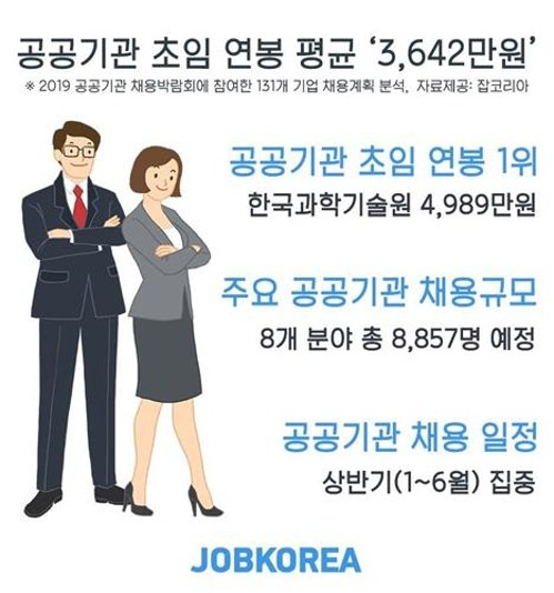【ソウル聯合ニュース】韓国の主要公的機関が今年採用する新卒者の初任給は、年収ベースで平均3642万ウォン(約354万円)と昨年に比べ5.1%上がる。就職情報サイトのジョブコリアが14日までに131機関の2019年採用計画を分析した。
