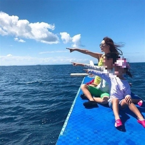 写真にはシューが子供達と一緒にリゾートで過ごしているような様子が写っている。シューは子供達と船に座ってポーズを取ったり、赤いアウターを羽織り船の上を歩くなど余裕のある様子だ。