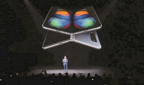 サムスン電子のコ・ドンジンIM部門長が20日に米サンフランシスコで折りたたみスマホの「ギャラクシーフォールド」を紹介している。(写真=サムスンアンパックユーチューブキャプチャー)