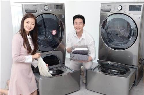LG電子によると、洗濯槽が上下2段に分かれた新概念の洗濯機「LGトロム・ツインウオッシュ」の販売台数が1~3月期に前年同期比で約50%増加した。2017年同期のほぼ2倍。15年の発売以降、販売台数を毎年大きく伸ばしている(同社提供)=4日、ソウル(聯合ニュース)