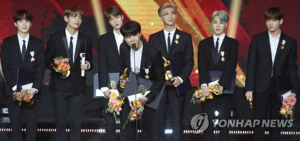「2018大韓民国大衆文化芸術賞」の授賞式で「花冠文化勲章」を授与された時のBTS(資料写真)=(聯合ニュース)