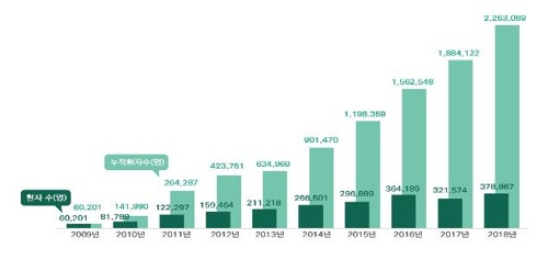 09年に外国人患者の韓国誘致が認められてから、韓国を訪れる外国人患者は年々増加している。09年から18年までの累計は226万人以上に達した。