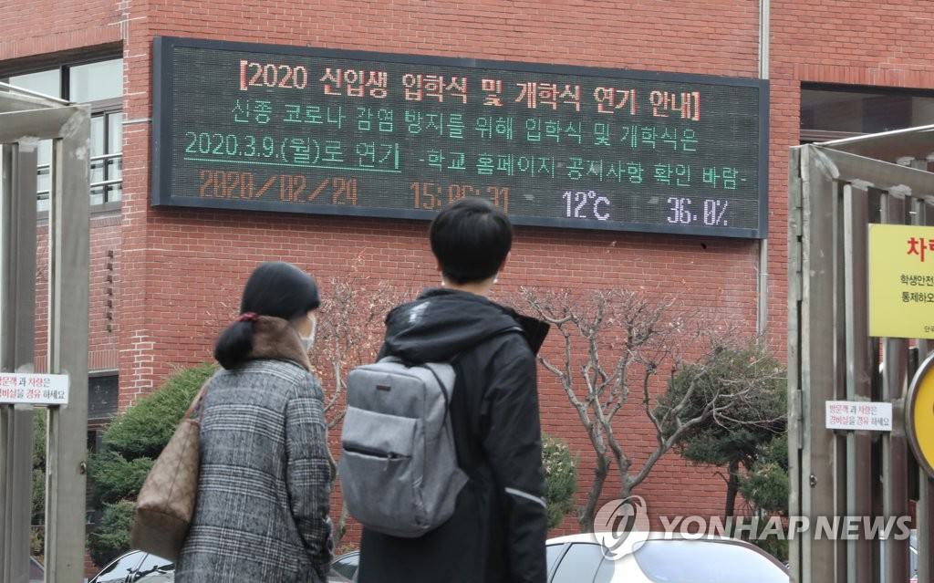 ソウル市江南区にある高校の外壁に、入学式と新学期延期の案内が掲示されている(資料写真)=(聯合ニュース)
