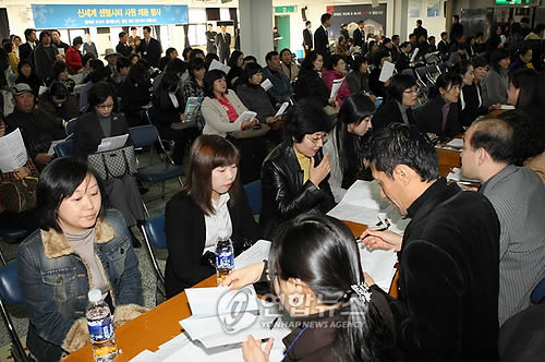 あるグループの採用博覧会のようす。願書受付テーブルの前には大勢の求職者が=(聯合)