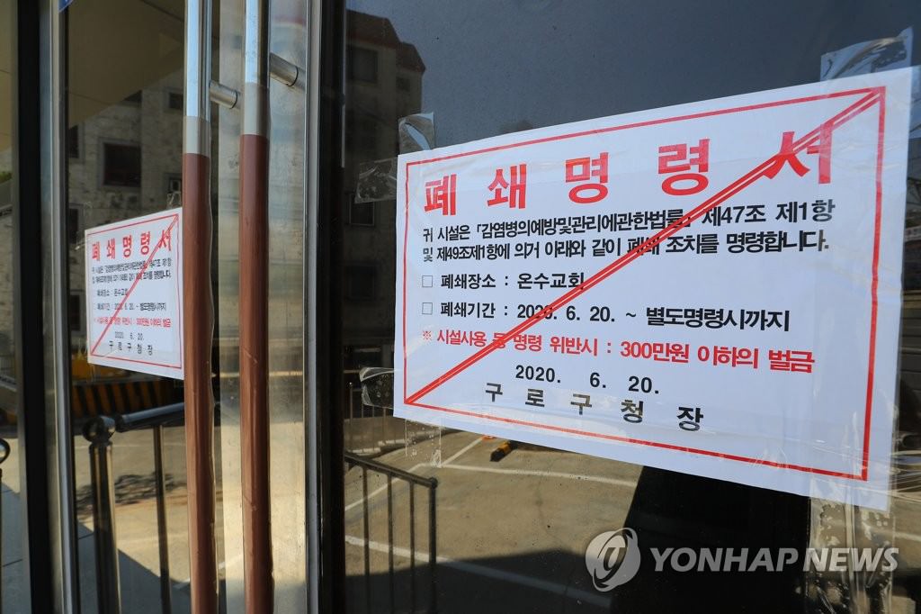 所属の牧師が新型コロナに感染したことが明らかになり、閉鎖命令書が貼られたソウル市内の教会=(聯合ニュース)