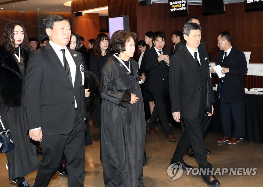 1月22日の辛格浩氏の告別式に参加した東彬氏(左端)、英子氏(中央)、東主氏=(聯合ニュース)