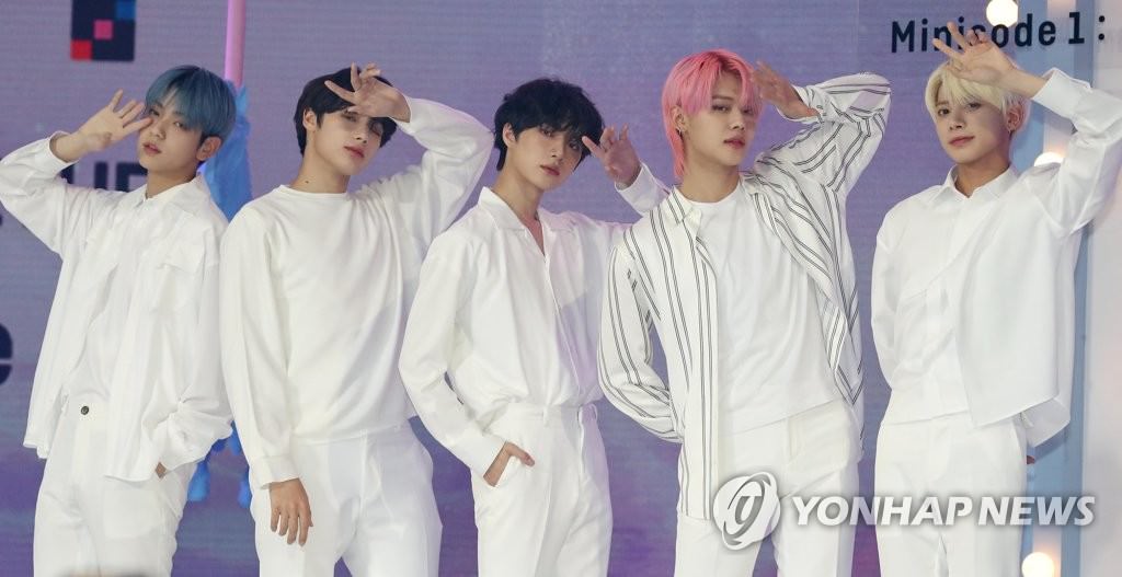ソウル市内で新譜の発表イベントを行ったTXT=26日、ソウル(聯合ニュース)