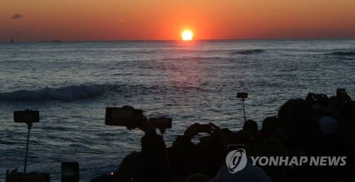 2020年1月1日の朝、江陵市の鏡浦海岸に集まった人たちが初日の出を撮影している=(聯合ニュース)