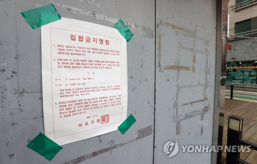 ソウル市内のクラブの入り口に貼られている集まりの禁止の命令書(資料写真)=(聯合ニュース)