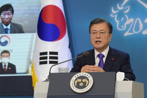 文在寅大統領が7日午前、青瓦台で非対面中継で行われた「2021年国民と共に行う新年挨拶の会」で挨拶している。[写真 青瓦台写真記者団]