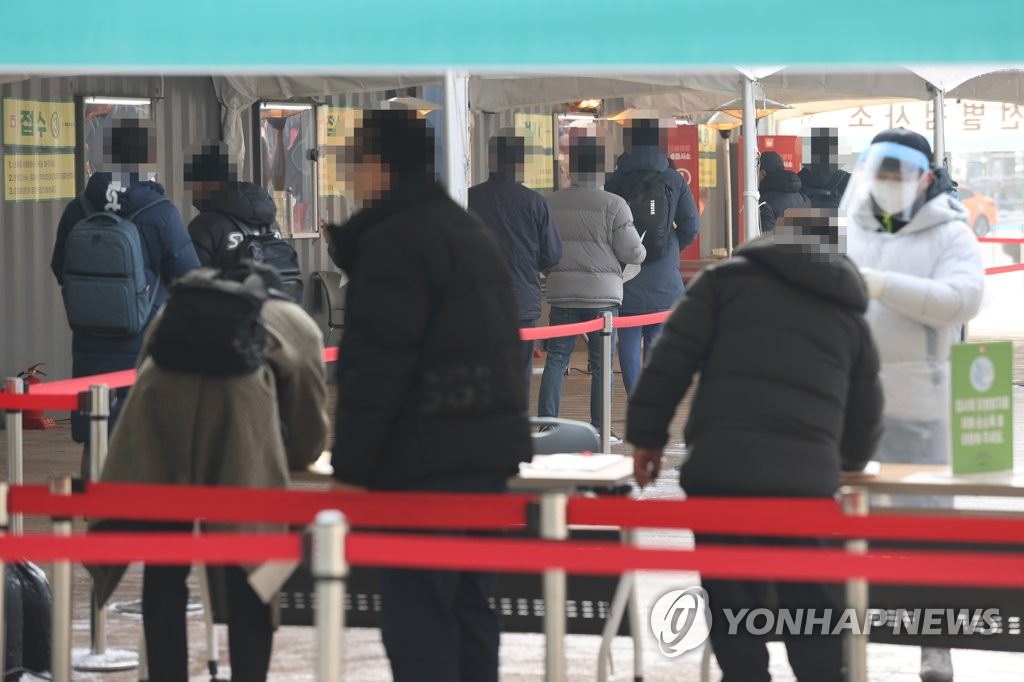 ソウル市庁前に設けられた新型コロナウイルスの臨時検査所で列を作る市民(資料写真)=(聯合ニュース)