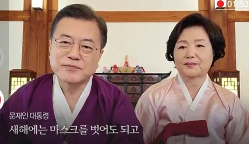 文大統領のビデオメッセージが12日、公開された。旧正月のあいさつをする文大統領夫妻=(聯合ニュース)≪転載・転用禁止≫