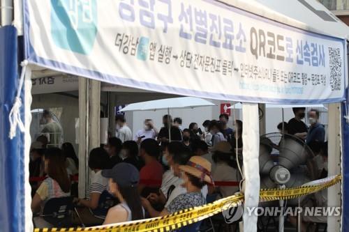 ソウル市内の保健所で、新型コロナウイルスの検査の順番を待つ人々=(聯合ニュース)