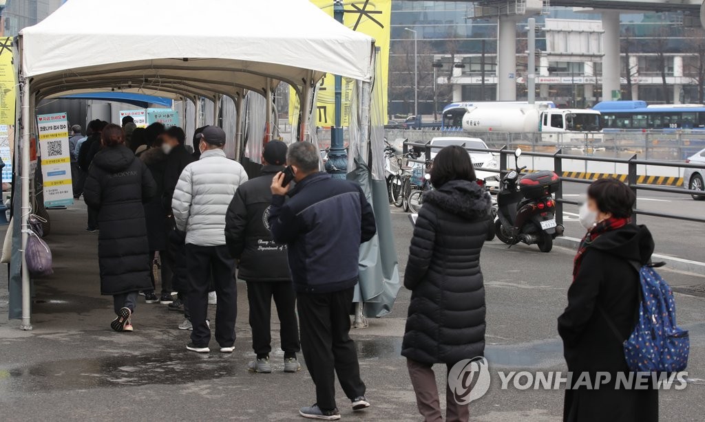 ソウル駅前の広場に設置された新型コロナウイルスの臨時検査所で順番を待つ人たち=11日、ソウル(聯合ニュース)