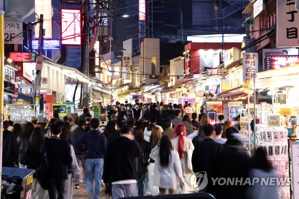 感染防止策「社会的距離の確保」の解除を前に多くの人でにぎわうソウル・弘益大周辺の繁華街=(聯合ニュース)
